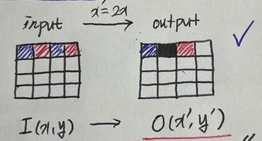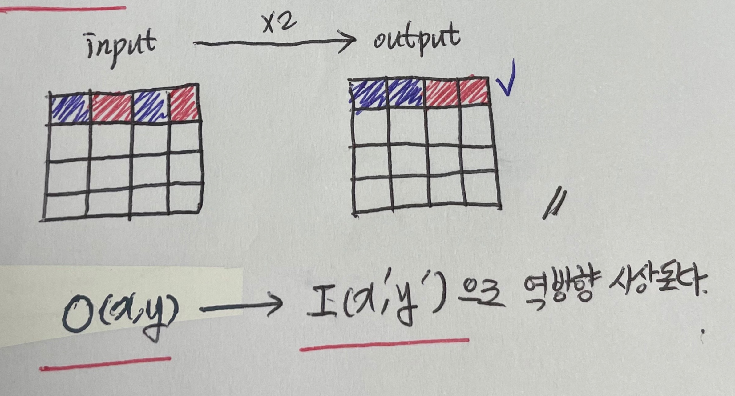 순방향처럼 늘려서 만들지 않고, 먼저 큰 사이즈의 출력공간을 만든 후 입력영상의 값을 참조한다.