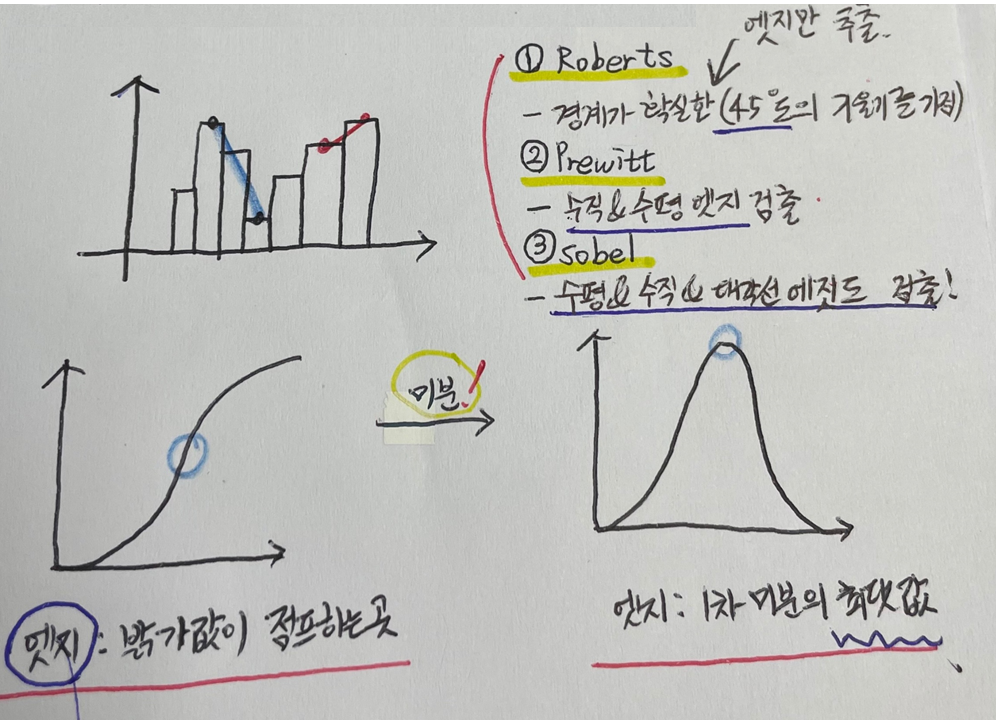 현재 픽셀과 다음 픽셀을 잇는 밝기 기울기를 구해서 물체의 윤곽을 잡는다.