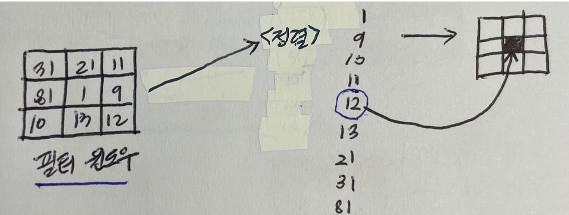 특정 구간의 화소들을 정렬하여 중간 자리에 오는 것을 출력 화소값으로 취하는 방법이다.